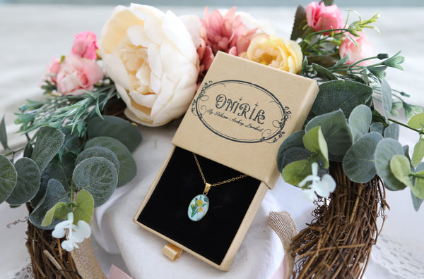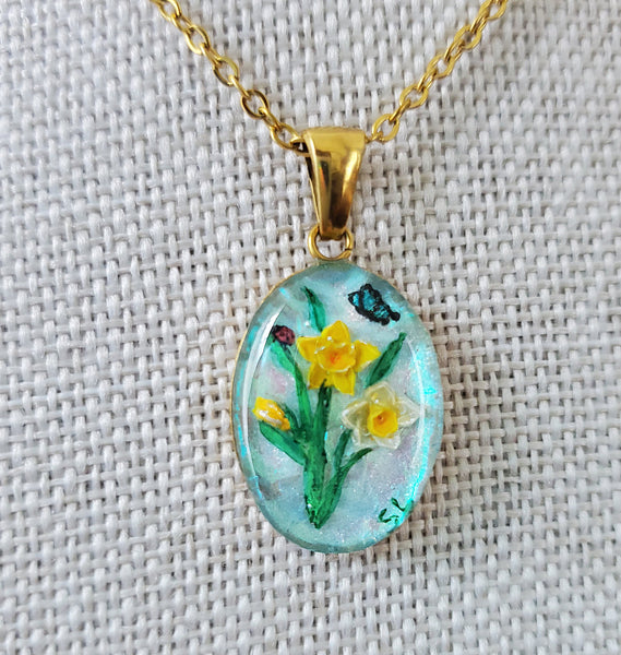 Petites Narcisses / jonquilles, entièrement sculptées et peintes à la main. Petite coccinnelle et papillon bleu. Fond iridescent blanc, très lumineux. Exemplaire unique.