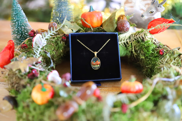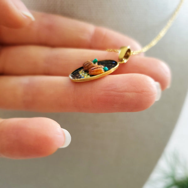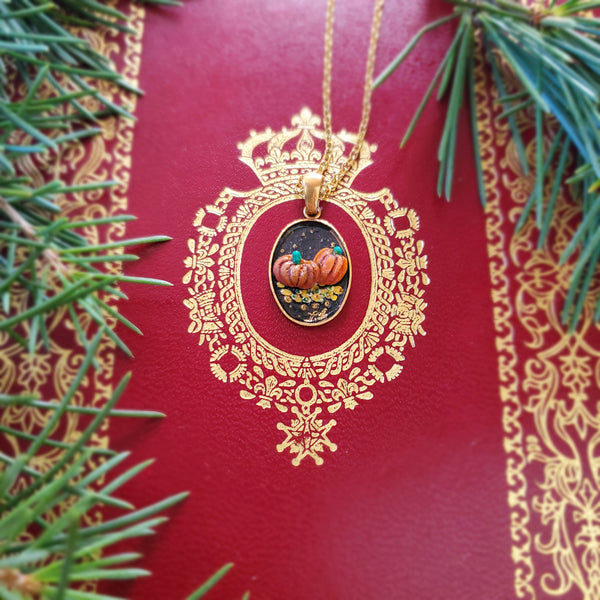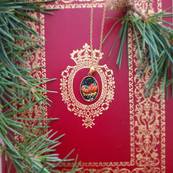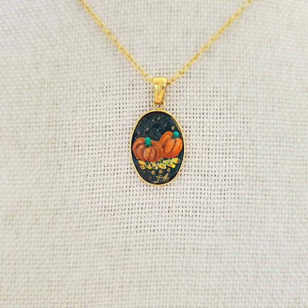 Pendentif noir laqué orné d'une citrouille et d'un butternut sur un fond de ciel étoilé.